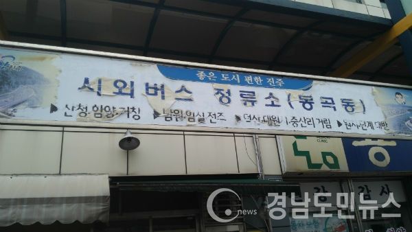 봉곡동 시외버스 간이정류장의 또다른 모습 도로변에서 표지판을 바라보면 페인트가 벗겨지고 일부 지명은 알아보기 힘든 상태다. 승객의 불편도 있지만 도시미관을 해치는 방해 시설물이다. 버스를 기다리는 승객에게 표지판의 상태를 설명하니 "도로변이라 잘 보이지 않는다"며 웃는다.