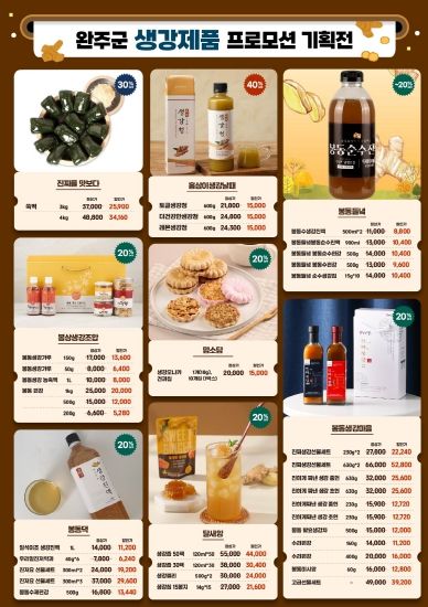 이번 할인판매 기획전에는 완주군 생강보존위원회와 생강을 활용한 가공품을 생산하고 있는 완주군내 식품기업 등이 참여하여 60여개 제품에 대하여 최대 40%까지 할인 판매한다.