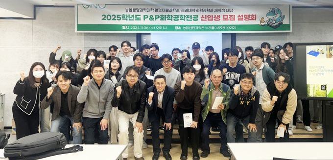 [경남도민뉴스=김종태 기자] 경상국립대학교 농업생명과학대학 P&P화학공학전공은 11월 6일 오후 농업생명과학관 누리홀에서 농업생명과학대학 환경재료과학과와 공과대학 화학공학과 2학년 학생을 대상으로 2025학년도 신입생 모집 설명회를 개최했다.