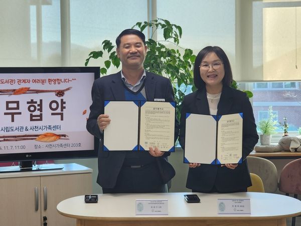 [경남도민뉴스=김종태 기자] 사천시립도서관과 사천시가족센터는 7일 사천시가족센터에서 가족들의 역량을 강화하고 가족이 함께 할 수 있는 독서문화를 조성하기 위한 업무협약을 체결했다.