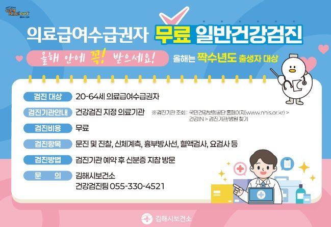 [경남도민뉴스=최미정 기자] 김해시는 의료급여수급권자의 만성질환 예방 및 치료를 위해 무료 일반건강검진 수검을 적극 독려하고 있다.