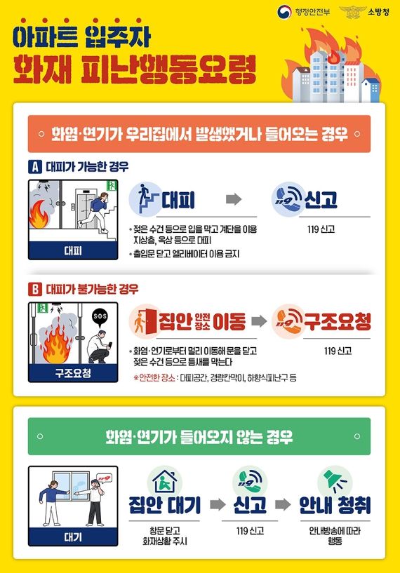 - (대피가 불가능한 경우) 화염·연기로부터 멀리 이동해 문을 닫고 젖은 수건 등으로 틈새 막기 및 119 신고