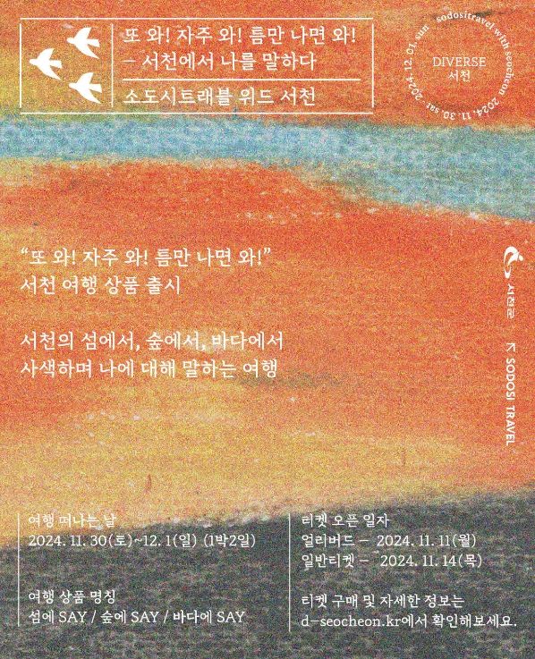 여행 참여신청은 오는 11일 얼리버드 티켓을 시작으로 총 100명을 모집할 예정이며 자세한 사항은 다이벌스(Diverse) 서천 누리집에서 확인할 수 있다.