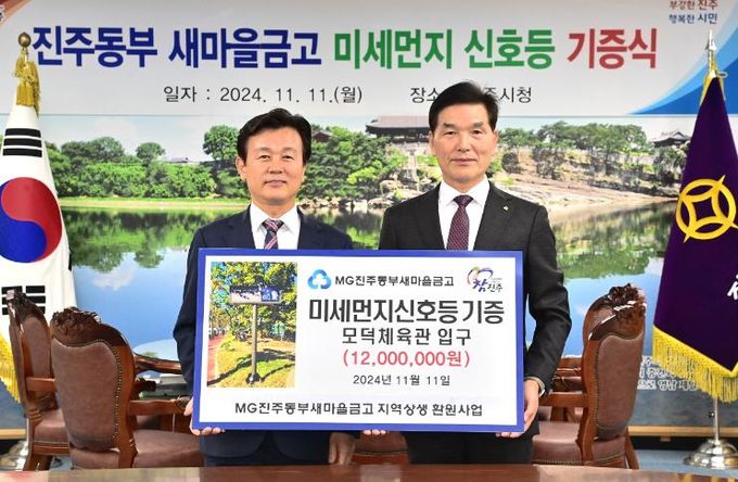 조규일 진주시장은 “진주시민들의 건강한 체육활동과 여가생활을 위해 모덕체육공원에 미세먼지 신호등을 설치해 주신 강성근 진주동부새마을금고 이사장님께 진심으로 감사드린다”고 말했다.
