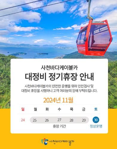 [경남도민뉴스=김종태 기자] 사천시시설관리공단은 사천바다케이블카 하반기 전기설비 안전검사 및 대정비를 위해 오는 25일부터 29일까지 5일간 임시휴장한다고 12일 밝혔다.