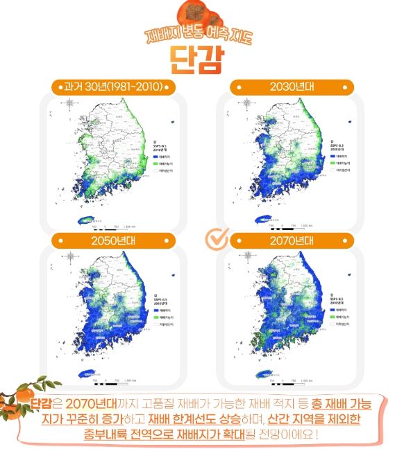 기후변화에 따른 국내 주요 과일 재배지 전망을 보면, 단감은 내륙지역에서 재배 면적이 지속해서 늘 것으로 예상한다. 이에 대응하려면 품종 다양화가 필요하지만, 현재는 특정 품종 편중 현상이 심하다. 실제, 우리나라 재배 단감의 79%는 일본에서 도입된 ‘부유’이다.
