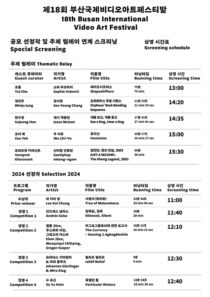 참여 작가 소개 및 작가별 작품 상영 시간은 미술관 누리집(www.gyeongnam.go.kr/gam)과 전시 공간에서 확인할 수 있으며 관람은 무료이다.