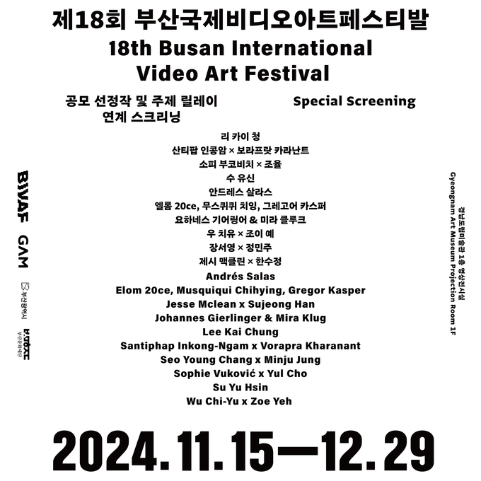 협력기관 부산국제비디오아트페스티발(BIVAF)은 영상예술의 활성화를 목적으로 매년 공모를 추진하고, 주제 기획을 통해 국내외 다양한 작품을 소개하는 등 동시대 영상예술의 흐름과 지형을 파악하고자 하는 단체이다.