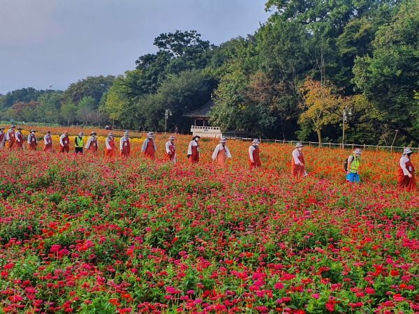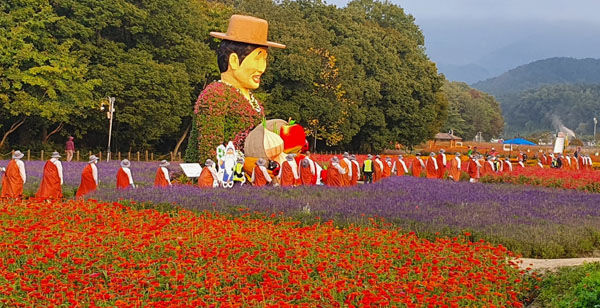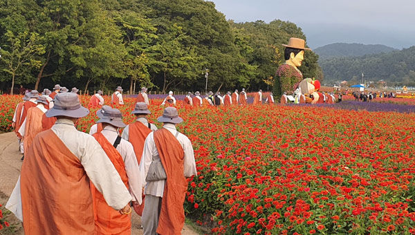 [경남도민뉴스] '삼보사찰 천리 순례'단이 7일 오전 7시 푸른 가을하늘 아래 함양산삼항노화엑스포 제1행사장의 형형색색의 꽃밭단지 사이를 걷고 있다.
