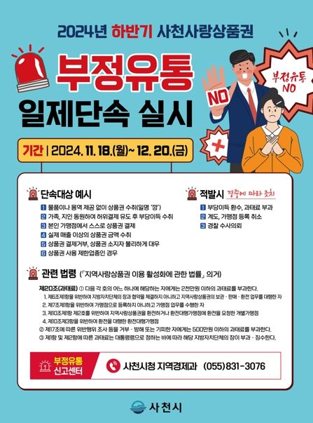 [경남도민뉴스=김종태 기자] 사천시는 사천사랑상품권의 건전한 유통질서 확립을 위해 부정유통 일제단속을 11월 18일부터 12월 20일까지 실시한다.