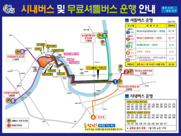 무료 셔틀버스가 운행되는 지역은 진주 IC방면의 경우 혁신도시(김시민 대교 앞)공터~진주성이며 문산 IC의 경우 혁신도시(공영주차장)공터~진주성, 합천과 의령방면의 경우 농산물도매시장~진주성, 진주역의 경우 진주역~진주성, 서진주IC의 경우 신안평거강변대로~더하우스 갑을 앞~신안공설운동장 보조경기장이다.