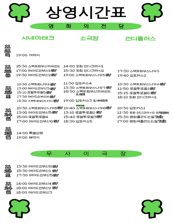 영화제의 세부 프로그램과 시간표 등 자세한 정보는 부산독립영화협회 누리집(www.indiebusan.com)과 공식 사회관계망서비스(SNS)를 통해 확인할 수 있다.