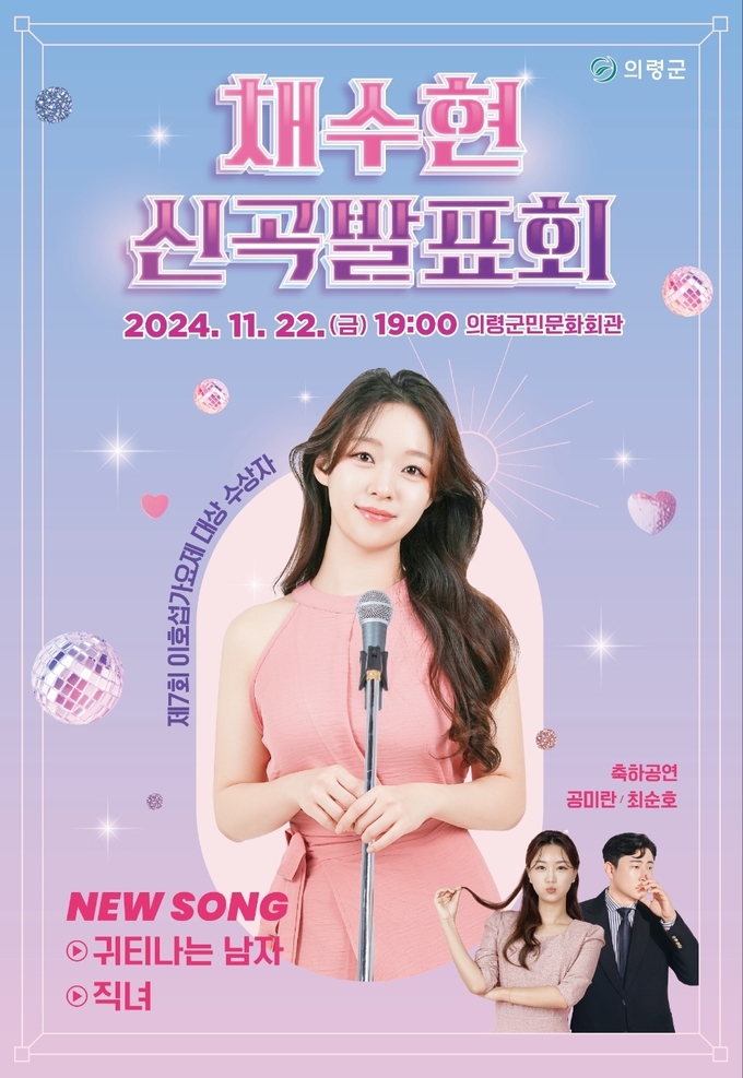 [경남도민뉴스=이상민 기자] 의령군은 2023년 제7회 이호섭가요제에서 대상을 수상한 채수현 씨의 신곡발표회를 22일 저녁 7시 군민문화회관에서 개최한다고 밝혔다.