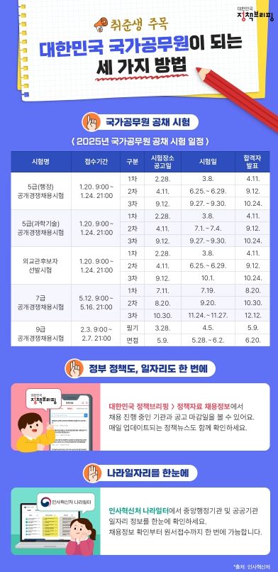 ※ 시험·직렬별 선발 예정 인원과 시험과목, 응시 자격 등 구체적인 시험 정보는 내년 1월 초 인사처 누리집 및 사이버국가고시센터 등을 통해 공고할 예정입니다.