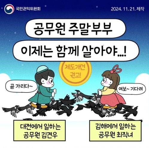 이번 개선안은 부부 공무원뿐만 아니라 공무원이 아닌 배우자를 둔 공무원도 대상인데요. 부부가 함께 살면서 일과 양육을 병행할 수 있는 공직문화가 정착할 수 있도록 힘쓰겠습니다.