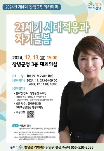 강연 신청은 11월 27일부터 12월 11일까지 창녕군 누리집 신청 또는 군청 기획예산담당관을 방문해 접수할 수 있으며, 누구나 무료로 수강할 수 있다.