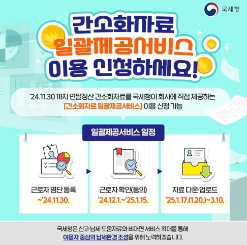 [경남도민뉴스=공동 기자] ’24.11.30 까지 연말정산 간소화자료를 국세청이 회사에 직접 제공하는 '간소화자료 일괄제공서비스' 이용 신청 가능합니다.