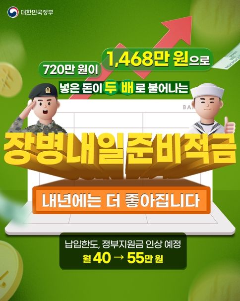[경남도민뉴스=공동 기자] 720만 원이 1,468만 원으로 넣은 돈이 두 배로 불어나는 장병내일준비적금 내년에는 더 좋아집니다.