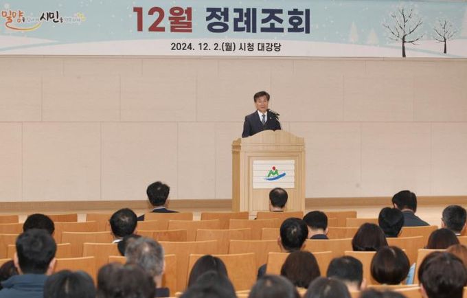 [경남도민뉴스=나희준 기자] 밀양시는 2일 시청 대강당에서 본청, 전 읍면동, 직속 기관, 산하기관 직원 등 300여 명이 참석한 가운데 12월 정례 조회를 개최했다.