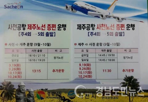 그동안 사천∼제주 노선은 금요일과 일요일에 대한항공과 아시아나항공이 4회씩 운항했다. 그러다가 대한항공이 지난달 19일과 26일, 이달 17일과 24일 등 모두 4회에 걸쳐 임시 증편한 바 있다.
