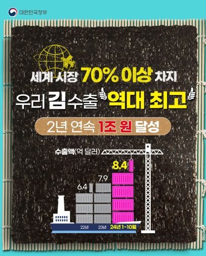 세계 김 시장 70% 이상을 차지하고 있는 우리나라 김 수출은 2010년 1.1억 달러에서 2023년 7.9억 달러로 7배 이상 증가했어요. 수출국 또한 2010년 64개국에서 2023년 122개국으로 확대됐습니다. 정부는 김 수출 지원을 위해 생산-가공-수출 등을 지원해왔습니다.