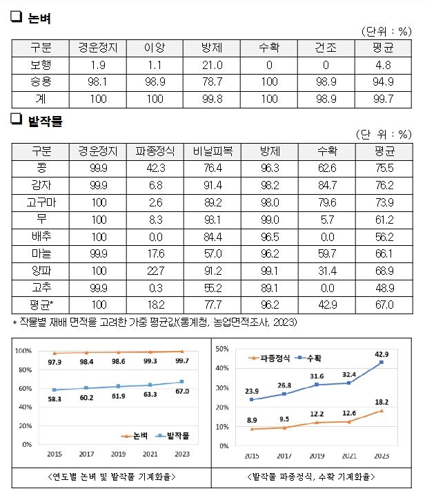 2023년 밭작물 기계화율은 67.0%로 지난 조사 때인 2021년보다 3.7%포인트 상승했다. 최근 10년 동안 기계화율 상승 폭이 최대 2.0%포인트였음을 고려하면 두 배 가까이 높은 수치다. 밭농업 기계화 촉진을 위한 농업기계 보급정책과 연구개발이 성과를 나타내기 시작한 것으로 보인다.