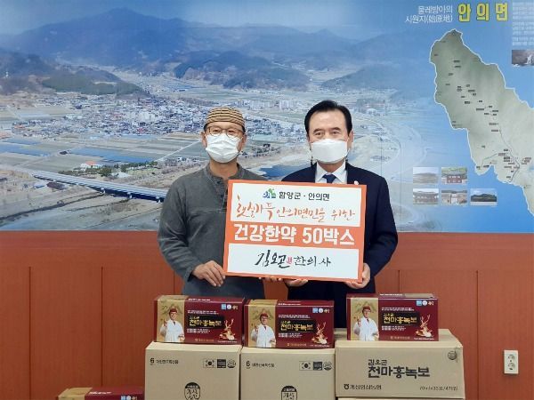 강의에 앞서 김오곤 한의사는 건강 한약 50박스(약 600만원 상당)를 함양군에 기탁하며 “코로나19 장기화로 안의면민의 건강이 떨어질까 염려되어 기탁을 마음먹게 되었다. 이날 강좌를 계기로 안의 면민들이 더욱 건강하고 코로나19 장기화로 체력이 저하된 주민들의 새로운 활력소가 되길 기대하며, 안의의 도시재생 뉴딜사업이 성황리에 진행되어 안의면이 새로운 약초 유통시장의 거점으로 거듭나길 소망한다.”고 밝혔다.