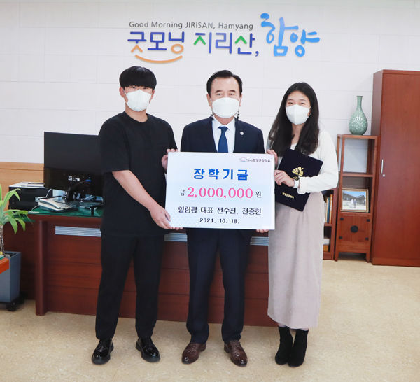 [경남도민뉴스] 함양군내 산양삼 재배업체인 힐링팜의 청년농부 전수진·전종헌 대표가 18일 장학금 200만원을 (사)함양군장학회에 전달하였다.