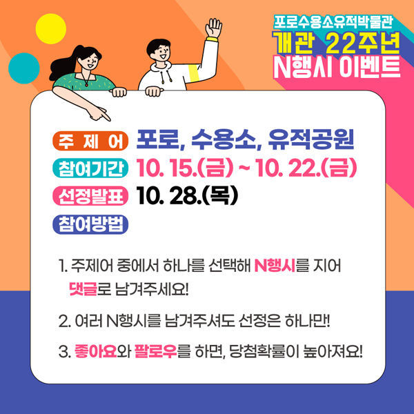 주제어는 '포로', '수용소', '유적공원'으로 이 중 하나를 선택해 N행시를 지어 댓글로 남기면 된다. 참가자격은 대한민국 국민이면 누구나 가능하고 오늘(15일) 부터 22일 까지 이벤트를 진행한다.