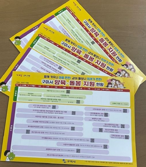 이 지도는 출생 후부터 제공되는 구미시의 양육 및 돌봄 지원 정책을 한눈에 볼 수 있도록 전단지 형태로 제작됐다. 특히 QR코드를 삽입해 구미시 공식 누리집의 상세 정보를 연계해 시민들이 복지 서비스에 쉽게 접근할 수 있도록 했다.