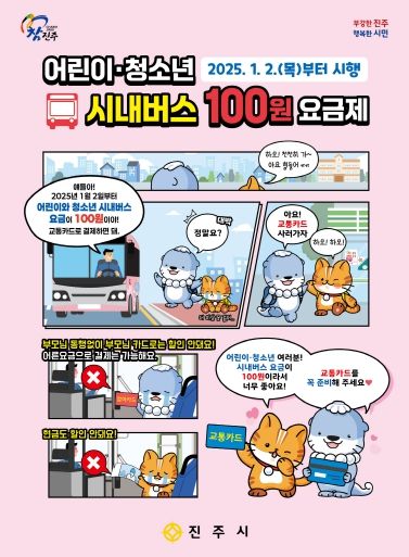조규일 진주시장은 "어린이·청소년 시내버스 100원 요금제는 우리 시의 미래인 어린이와 청소년을 지원하는 중요한 정책"이라며, "이번 정책을 통해 더 많은 아이들이 대중교통을 편리하게 이용하고, 유동인구 증가로 지역경제에 활력을 불어넣을 것으로 기대한다"며 어린이와 청소년들의 많은 이용을 당부했다.