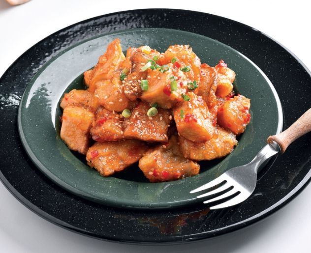 깍둑썬 ‘설원’을 전분 반죽을 입혀 노릇하게 튀긴 뒤 설탕, 식초, 간장 등을 넣은 양념장에 버무리면 ‘깐풍 설원’이 완성된다. 부드러운 식감과 고소한 맛이 어우러져 고기 대체 식재료를 찾는 채식주의자 식단으로도 손색없다.