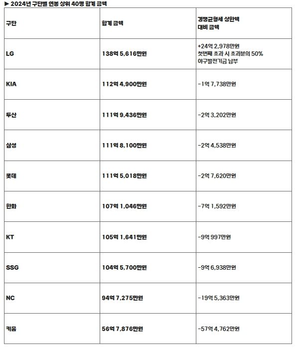 금액 집계 결과LG는 상위 40명의 합계 금액이 138억 5,616만원으로 경쟁균형세 상한액 대비 24억 2,978만원이 초과돼, 해당 액수의 50%인 12억 1,489만원을 야구발전기금으로 납부한다.