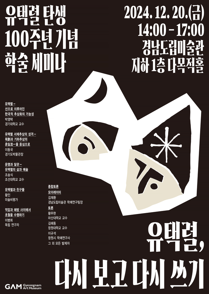 발표는 경기대 박영택 교수의 ‘유택렬-선으로 이루어진 한국적 추상화의 가능성’을 시작으로, 경기도박물관장 이동국의 ‘유택렬 서체추상의 성격과 한국근현대미술사적인 의의’, 조선대 조송식 교수의 ‘운명과 달관-유택렬의 삶과 예술’, 미술평론가 황인의 ‘유택렬과 친구들’, 독립연구자 이병희의 ‘억압과 해방 사이에서 초월을 수행하기’로 이어진다.