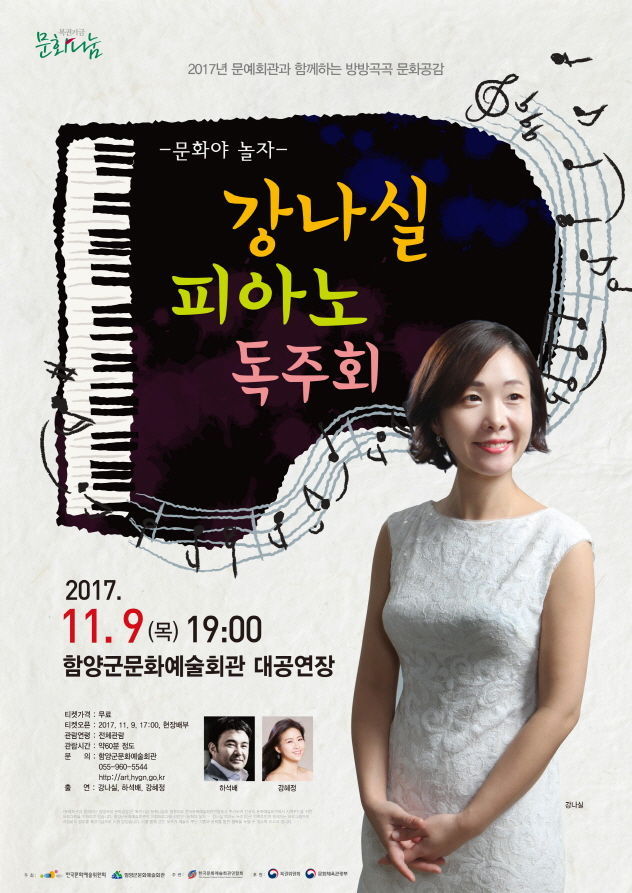 함양군은 오는 9일 오후 7시 함양문화예술회관 대공연장에서 음악에 대한 무한한 열정과 천부적인 표현력으로 바로크부터 현대, 클래식 음악과 그녀만의 감성으로 편곡된 음악을 연주하여 모든 청중을 매료시키는 ‘강나실 피아노 독주회’를 연다고 6일 밝혔다.