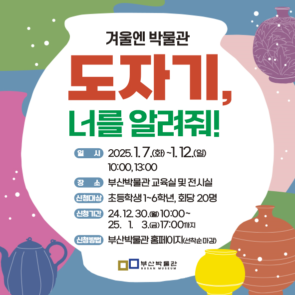 [경남도민뉴스=신석주 기자] 부산시립박물관은 오는 30일부터 내년 1월 3일까지 초등학생 대상 교육프로그램 '겨울엔 박물관 – 도자기, 너를 알려줘!'의 참가자를 모집한다고 밝혔다.