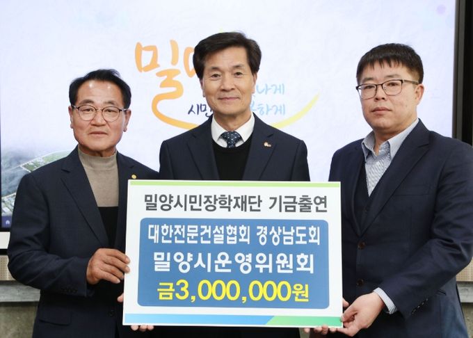 [경남도민뉴스=나희준 기자] (재)밀양시민장학재단은 23일 대한전문건설협회 경상남도회 밀양시운영위원회 회원들이 밀양시청 시장실을 방문해 지역인재 양성을 위한 장학금 300만원을 기탁했다고 밝혔다.