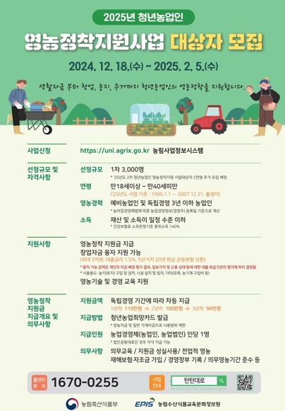 대상자는 18세 이상 40세 미만의 독립경영(예정자 포함) 경력 3년 이하인 청년으로, 본인 세대 건강보험료 산정액 기준 중위소득 140% 이하 등의 요건을 갖춰야 한다.