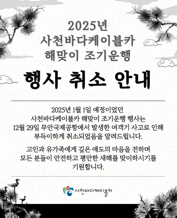 한편, 사천시시설관리공단은 2025년 1월 1일 예정이었던 ‘사천바다케이블카 조기운행 행사’를 전면 취소하기로 했다.