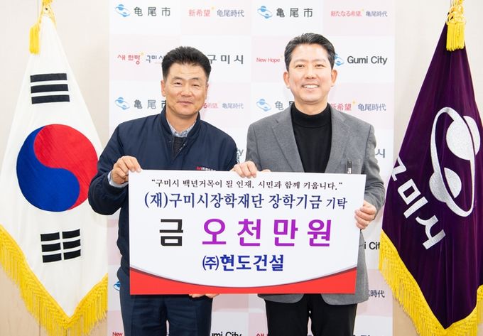 이번 기탁으로 ㈜현도건설은 구미시장학재단의 ‘Gold Honor Club(5천만 원 이상 기부자)’에 헌액됐다.