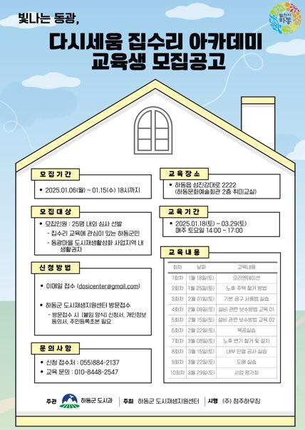 [경남도민뉴스=이형섭 기자] 하동군이 1월 6부터 15일까지 ‘빛나는 동광, 다시세움 집수리 아카데미’ 교육 참여자를 모집한다.