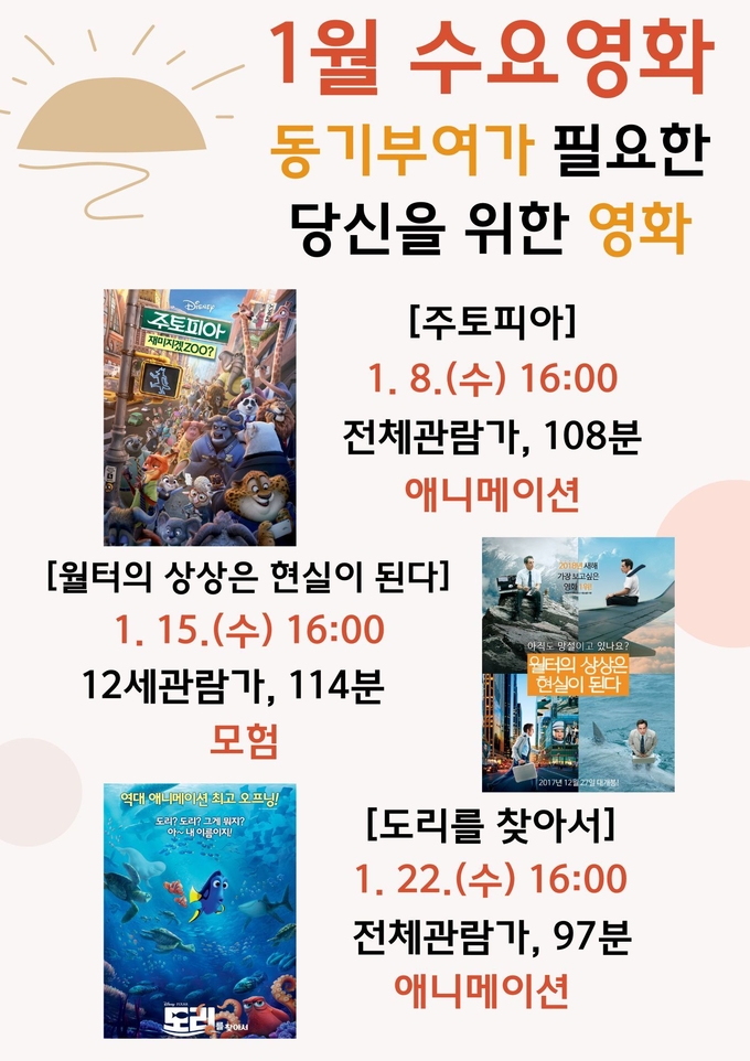 1월은 ‘동기부여가 필요한 당신을 위한 영화’라는 주제로 1월 29일 설날 연휴를 제외한 매주 수요일 오후 4시, 1층 종합영상실에서 총 3회 상영한다.