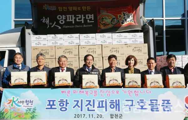 (합천/권연홍 기자) = 합천군(군수 하창환)과 합천유통(대표 장문철)은 20일 유례없는 지진으로 큰 피해를 입은 포항시 이재민에게 약 5백만원 상당의 긴급 구호물품을 전달했다.