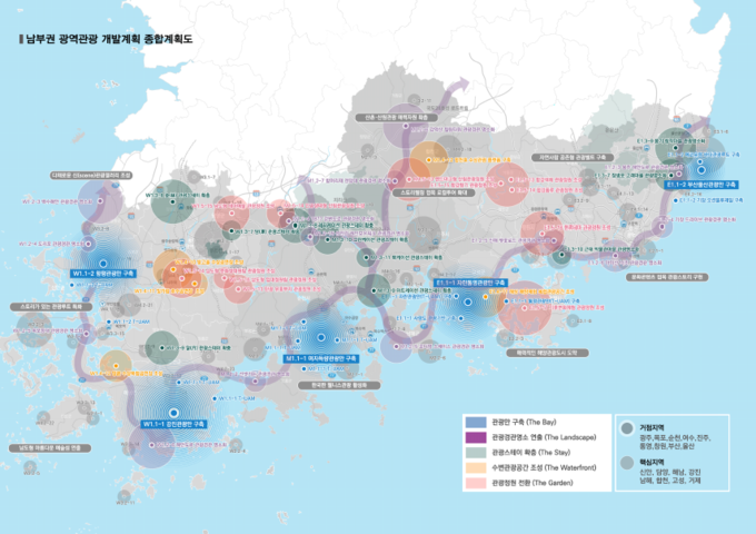 남부권 광역관광 개발사업은 ‘하루 더 머무는 여행지 조성’을 목표로 남동권, 남중권, 남서권 등 3개 권역으로 나누어 남부권 K-관광 휴양벨트를 구축하는 사업으로, 경남에만 10년간('24.~'33.) 총 1조 1천억 원을 단계별로 투자하는 초대형 국책사업이다.