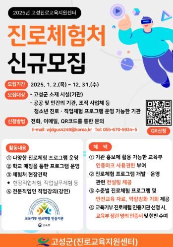 신청 대상은 고성군에 소재지를 두고, 사업자등록증이 있으며, 청소년 진로 교육에 관심 있는 사업장, 기관, 단체라면 누구나 신청할 수 있다.