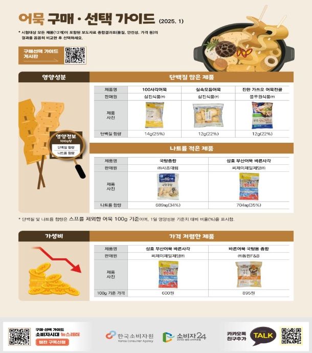 [경남도민뉴스=공동 기자] 고물가로 집에서 끼니를 해결하려는 집밥 선호도가 증가하면서 어묵을 요리재료로 활용하는 소비자가 증가하고 있다. 이에 한국소비자원이 어묵(사각어묵 6개모듬어묵 6개, 총 12개)의 품질, 안전성 등을 시험하고 표시실태 및 가격 등을 조사했다.