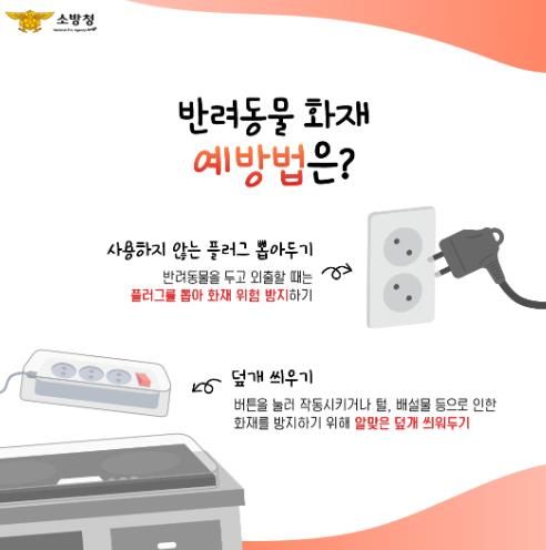 반려동물로 인한 화재를 예방하기 위해선 ▲외출 시 사용하지 않는 전선 플러그 뽑기 ▲버튼형 제품은 쉽게 작동되지 않도록 덮개 덮어두기 ▲배선 보호 캡 설치하기 ▲주택용 소방시설 설치하기 등의 안전 수칙을 준수해야 한다.