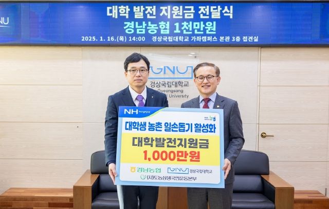 [경남도민뉴스=김종태 기자] 경상국립대학교는 경남농협이 대학발전지원금 1000만 원을 기부했다고 밝혔다. 발전지원금 전달식은 1월 16일 오후 대학본부 접견실에서 열렸다.