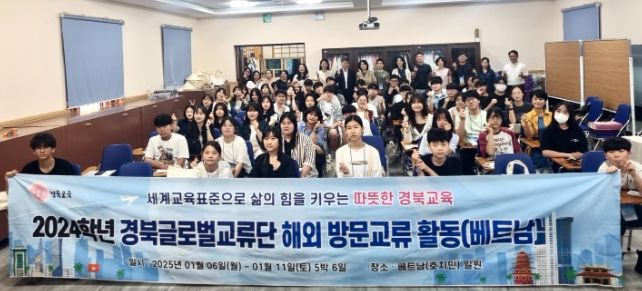 경북글로벌교류단 소속 교사 10명과 학생 50명, 인솔단 5명 등 총 65명으로 구성된 이번 교류단은 호찌민시교육훈련국 산하 초등학교 2곳과 중학교 1곳, 고등학교 1곳을 방문해 다양한 교류 활동을 진행했다.