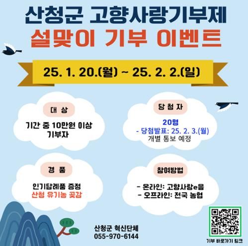 [경남도민뉴스=변정형 기자] 산청군은 오는 20일부터 2월 2일까지 ‘설맞이 고향사랑기부제 특별 이벤트’를 추진한다고 17일 밝혔다.